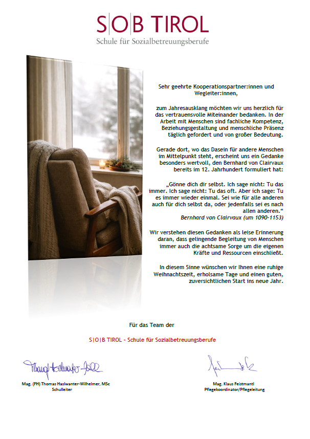 zum Jahresausklang möchten wir uns herzlich für das vertrauensvolle Miteinander bedanken. In der Arbeit mit Menschen sind fachliche Kompetenz, Beziehungsgestaltung und menschliche Präsenz täglich gefordert und von großer Bedeutung.