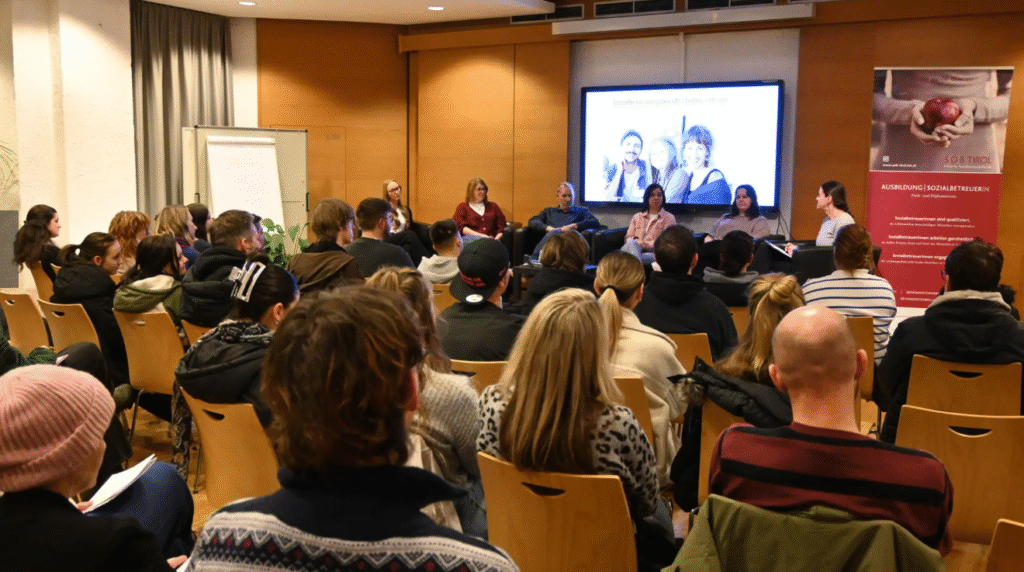 Bei unseren Informationsabenden erfährst du alles über die Ausbildungen in Altenarbeit, Behindertenarbeit, Behindertenbegleitung und Familienarbeit sowie zum Vorbereitungslehrgang ab 16 Jahren – direkt von Lehrenden, Studierenden und Absolvent:innen.